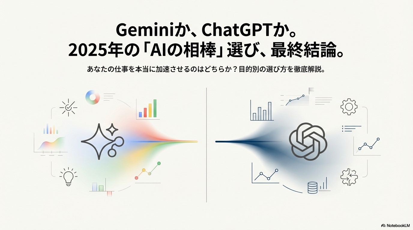 最後にまとめです。GeminiとChatGPT、どっちがいいかという問いへの答えは、あなたがAIに何を求めているかによって変わります。